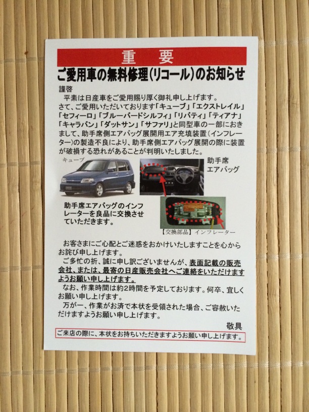 本日、リコール修理行って来ます。